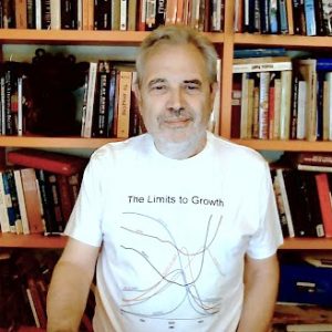 Después de jubilarme de la universidad, ahora participo mucho en el Club de Roma. En la foto, me ven con una camiseta que reproduce el escenario del «Caso base» del informe de 1972 «Los límites del crecimiento». En el 50° aniversario de esa publicación, publicamos …Leer mas +