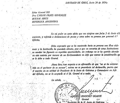 Carta del nuevo Comandante en Jefe del Ejército, General Augusto Pinochet Ugarte, a su antecesor en el cargo General Carlos Prats González, 7 de septiembre de 1973. Prats y su cónyuge serán asesinados tres meses después en Buenos Aires, por funcionarios de la DINA.