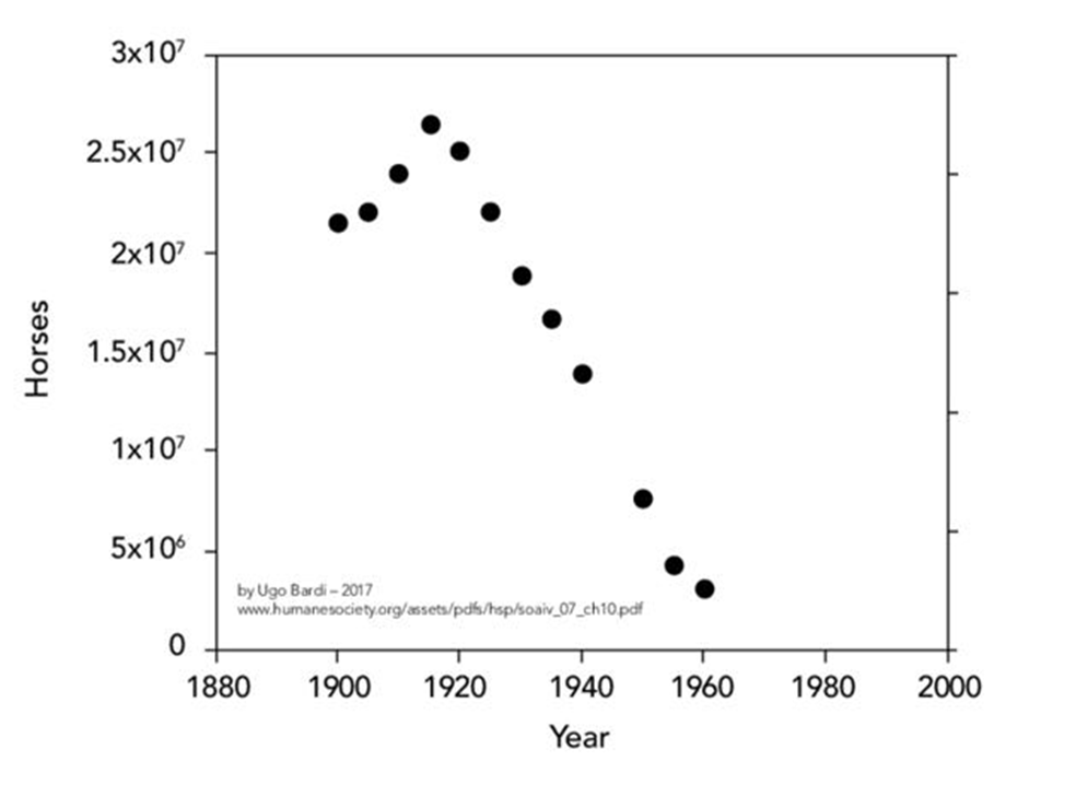 Otra posible analogía es la de los caballos. No es lo mismo que los gorilas. A diferencia de estos, los caballos eran útiles para los seres humanos y prosperaron como animales domésticos. Pero cuando se desarrollaron los motores y los vehículos de carretera, los caballos perdieron su función; dejaron de ser útiles. De nuevo, los humanos no sentían odio ni malas intenciones hacia los caballos; sin embargo, la población equina se desplomó siguiendo una típica curva de Séneca. Aquí están los datos de Estados Unidos: