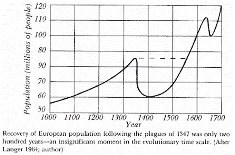 Una vista esquemática de la población europea durante aproximadamente un milenio. Tenga en cuenta los dos colapsos: ambos tienen la típica «forma de Séneca» [4], es decir, el declive es más rápido que el crecimiento. El primer colapso fue causado por el hambre y la peste negra, el segundo por la guerra de los 30 años y las plagas y hambrunas asociadas.