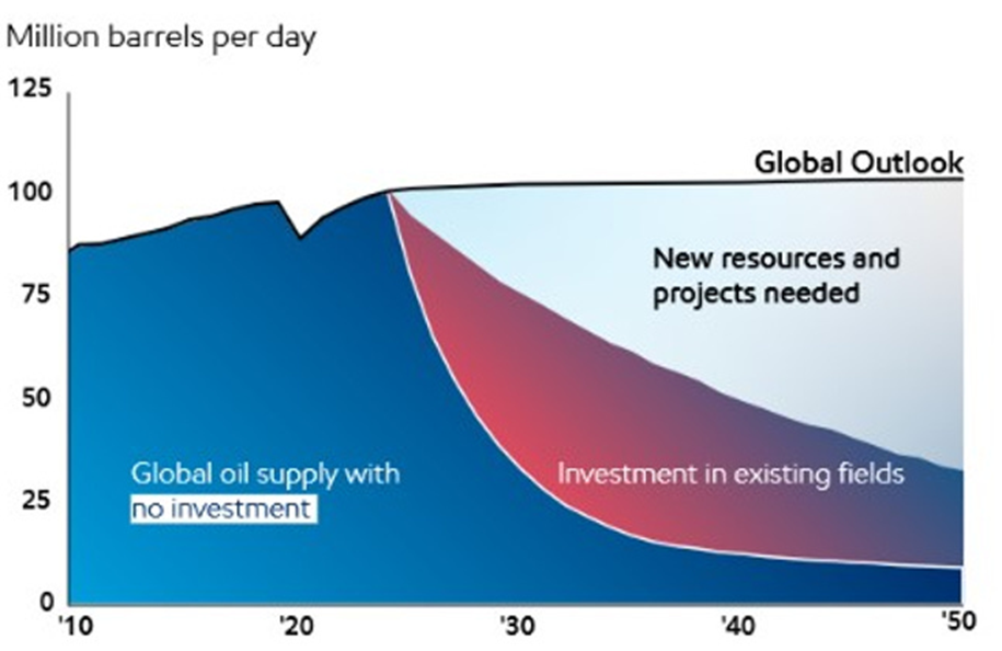 El gráfico consta de dos secciones: la demanda proyectada de petróleo y diferentes escenarios de suministro. La demanda mundial de petróleo ha aumentado de aproximadamente 80 a 100 millones de barriles diarios desde 2010, y se mantendrá en torno a los 100 millones de barriles diarios hasta 2050. El informe también muestra que, sin una inversión continua, la oferta se desploma rápidamente. Incluso con la inversión en yacimientos existentes, la producción de petróleo se desploma de unos 100 a 30 millones de barriles diarios para 2050. Solo el tercer escenario —la necesidad de nuevos recursos y proyectos— mantiene la oferta cerca de los niveles actuales, y eso sin crecimiento. Aún está por verse cuáles serán esos nuevos recursos y proyectos.