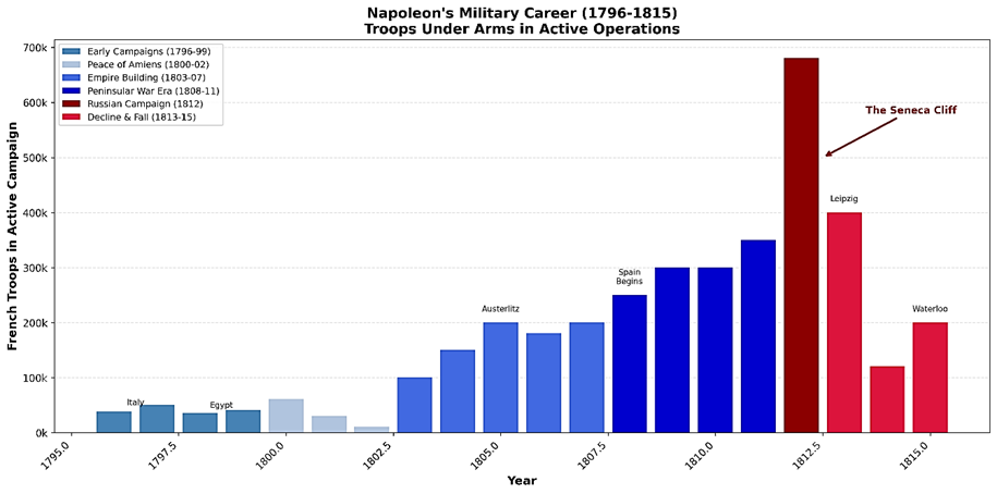 La historia se basa en patrones recurrentes. Nunca se repiten con exactitud, sino que siempre rondan un punto central —un «atractor»—, el destino inevitable que aguarda a la mayoría de las acciones humanas. Uno de estos patrones es el ciclo de los grandes líderes. Personas de gran envergadura que se embarcan en una carrera meteórica de éxitos militares, ganando cada batalla hasta la última. La que los lleva a la ruina. Estas carreras son otro ejemplo del Principio de Séneca: «Los aumentos son de crecimiento lento, pero la caída a la ruina es rápida».