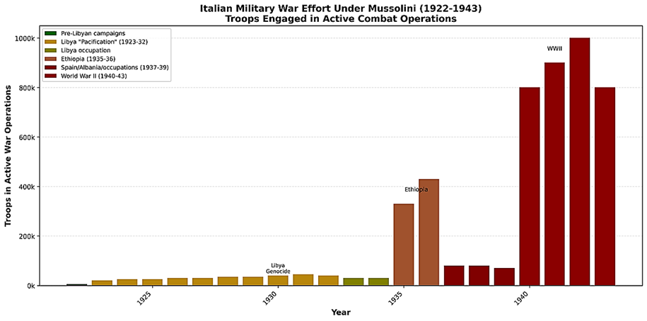 Para Mussolini, el punto de inflexión fue la invasión de Etiopía, tras una serie de campañas de baja intensidad en el norte de África. El éxito de la invasión fue su momento de mayor popularidad, con el lema «Mussolini siempre tiene razón» ampliamente adoptado. De hecho, fue un desastre que debilitó sustancialmente la capacidad militar e industrial de Italia. Posteriormente, la caída de Mussolini llegó con una serie de campañas mal concebidas durante la Segunda Guerra Mundial. Al igual que para Napoleón, el golpe fatal llegó desde Rusia, donde Italia sufrió la pérdida casi total de todo el cuerpo expedicionario de más de 300.000 hombres.