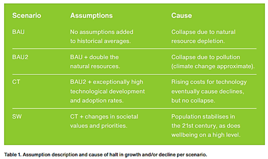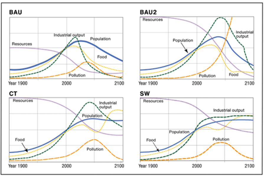 Figura 1. Escenarios BAU, BAU2, CT y SW del libro de Gaya Herrington “Los límites del crecimiento”, 2004 [6]. Gráficos: Hillary Moore.