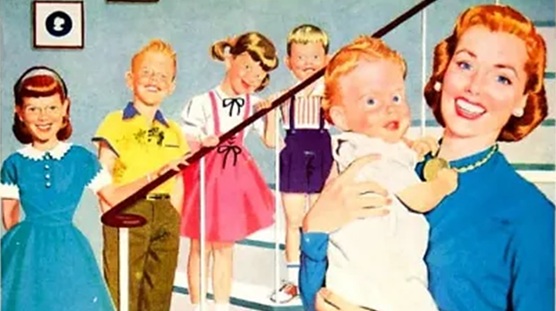| Una feliz familia estadounidense en un anuncio de los años 50: la madre y sus cinco hijos. El baby boom estaba en pleno apogeo en Estados Unidos en aquella época, pero ¿ocurrió también en el resto del mundo? ¿Se producirá un baby boom tras el fin de la guerra actual en Oriente Medio? |