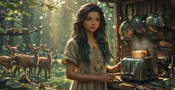 La diosa Gaia en su cocina en el bosque. Ha decidido evitar la contaminación utilizando una tostadora eléctrica alimentada por paneles fotovoltaicos en lugar de una hoguera.