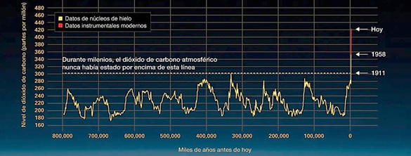 El notable cambio climático progresivo de los últimos ca. casi 200 años se presenta en notas de prensa y en redes sociales en general, como un sino de la humanidad actual, y parte de los grandes ciclos de cambios naturales que ha sufrido el planeta Tierra en sus millones de años de evolución, como para evadir tendenciosamente la responsabilidad del homo sapiens de haberlo provocado por la enorme quema de combustibles fósiles, como lo señala la IA en su respuesta copiada más arriba. Así lo muestra la curva de la imagen de cabecera, según ha informado la NASA: la variación de la concentración de dióxido de carbono (CO2) –el principal gas que provoca el ‘efecto invernadero’ y el calentamiento de la Tierra— mantenido desde hace 800 millones de años hasta c. 1850 con variaciones cíclicas de 180- 280 ppm (partes por millón), sin haber superado jamás la línea de las 300 ppm. Hoy estamos superando ya las 420 ppm.
