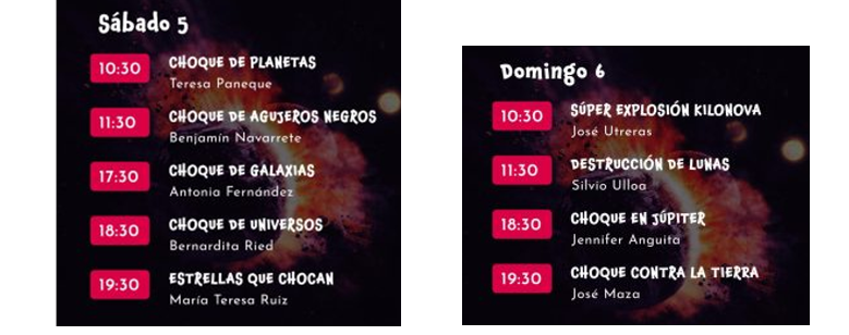 10:30 horas: “Choque de Planetas”, dictada por Teresa Panque, estudiante del Doctorado en Astronomía en el Observatorio Europeo Austral (ESO) como parte del programa de la Escuela Internacional de Investigación Max-Planck (IMPRS), en Múnich, Alemania