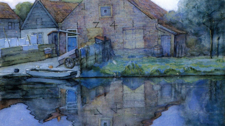 En esta acuarela percibimos el interés en la investigación esotérica. Mondrian estaba interesado en los opuestos, por ejemplo, la verticalidad y la horizontalidad. Aquí también se insertan líneas oblicuas que forman triángulos que se reflejan en el agua.