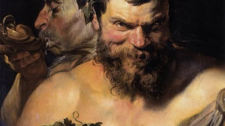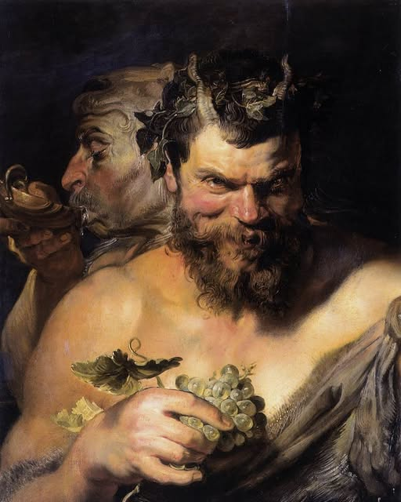 En primer plano se representa un sátiro con una mirada mefistofélica. Lleva un racimo de uvas en la mano, una alusión al placer del vino que un segundo sátiro detrás de él está disfrutando de una copa.