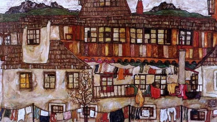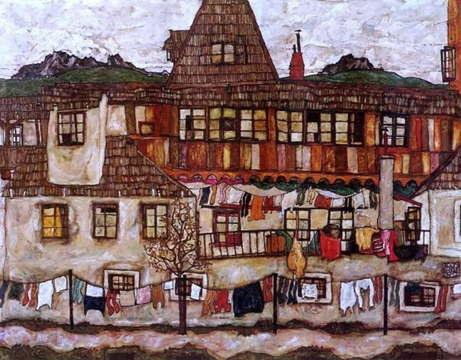 Esta pintura, que data de la plena madurez del artista, resalta el extraordinario e inconfundible estilo gráfico de Schiele, capaz de capturar el microcosmos colorido y rítmico de una sencilla arquitectura doméstica. Es un verdadero placer para la vista explorar cada detalle de la pintura: seguir el patrón de la ropa tendida, la secuencia irregular de ventanas, la densa textura de las tejas.