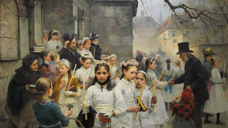 La escena representa a un grupo de niñas saliendo de la iglesia tras su Primera Comunión. El contraste de contrastes resulta inmediatamente llamativo: el blanco luminoso de los vestidos de las niñas ilumina la composición y contrasta con el negro sobrio de la ropa de los adultos. Un tema recurrente en la obra del artista es el diálogo entre diferentes edades, representado aquí por la convivencia de jóvenes y ancianos.