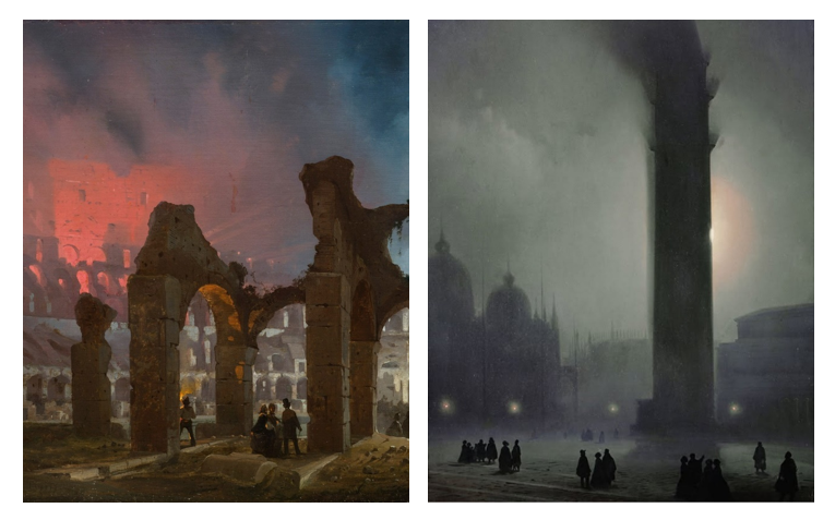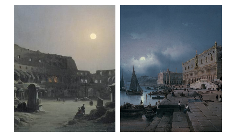 En la selección de obras que propongo, podemos apreciar el espíritu romántico del pintor, que ilumina los nocturnos con destellos de luz. Tanto Venecia como el Coliseo se iluminan, todo se impregna de energía, utilizando un lenguaje innovador para su época.